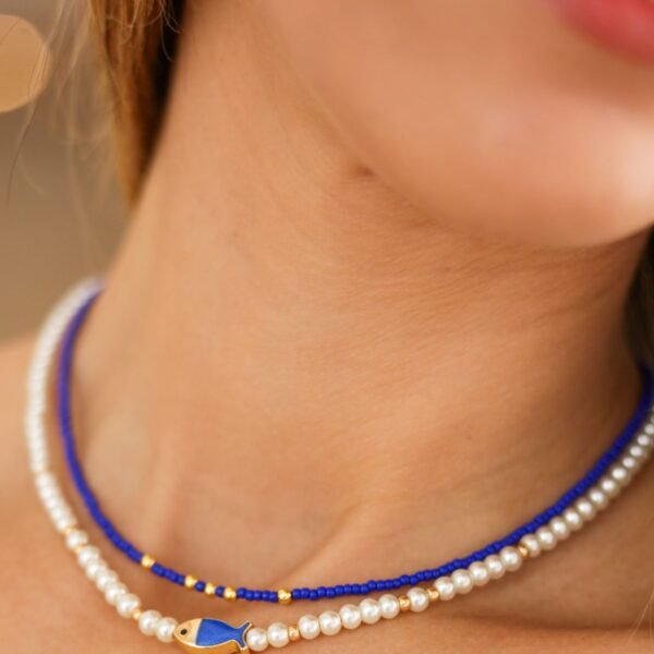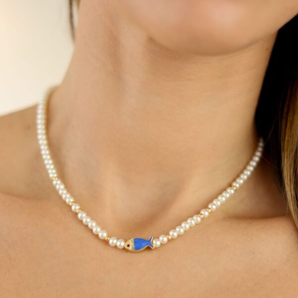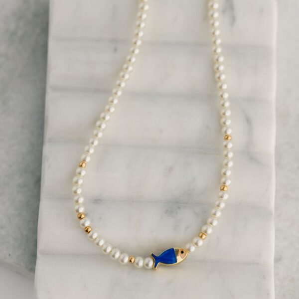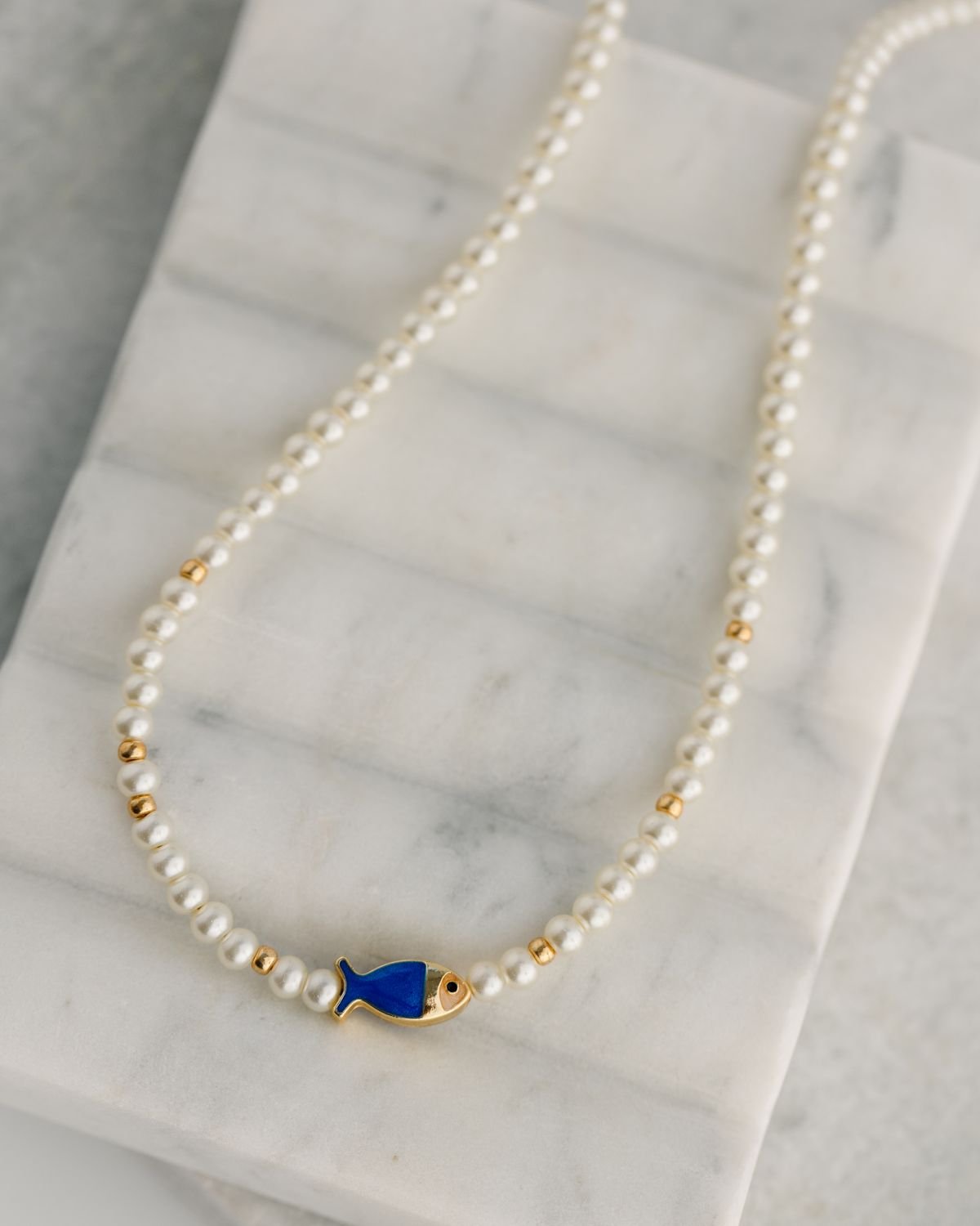 This Kinley Necklace features a beautiful combination of faux pearls and gold beads. including a whimsical fish bead. Ideal for layering or wearing on its own. this necklace is the perfect summertime accessory.